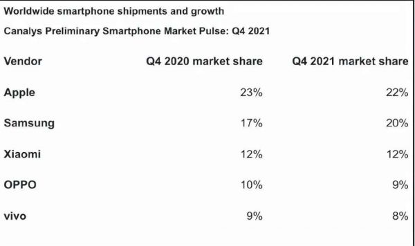 根据Strategy Analytics公布的数据显示,2021年Q3中国智能手机市场的排位是vivo、OPPO、荣耀、小米和苹果, 彼此之间差距不算太大;2021年Q4中国市场的数据还没公布,但Canalys公布的全球数据指出,苹果成为了全球销量第一的品牌,主要得益于iPhone 13系列在中国市场的热销。