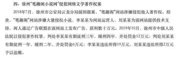 而本文的主角笔趣阁,就是其中一个侵害了作者权益的盗版小说网站,“免费”也只不过是掩饰违法事实而用的幌子。笔趣阁网站运营人李某某和技术支持刘某某以广告联盟的形式,更是获利数十万元。2019年,经阅文集团的举报,笔趣阁等一批盗版网站被关停,李某某和刘某某也分别被判有期徒刑三年缓刑四年、有期徒刑一年缓刑二年,两者罚金共计18万。