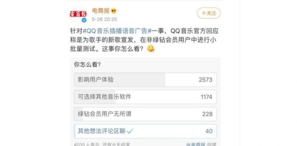 QQ音乐曾在2020年5月小范围测试过插播广告方案,但消息一出立即引起了许多网友的吐槽。在电商报发起的一项相关调查中,选择“影响用户体验”和“可选择其他音乐软件”的用户占比达到93.3%,说明插播广告方案可能在国内市场行不通,除非QQ音乐和Spotify一样选择给予免费用户更多福利,如更丰富的免费曲库和更简洁的软件界面。