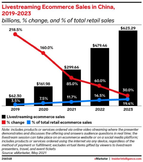 eMarketer预计,2023年中国直播购物市场可以增加到6000亿美元,占比上升到19.4%。