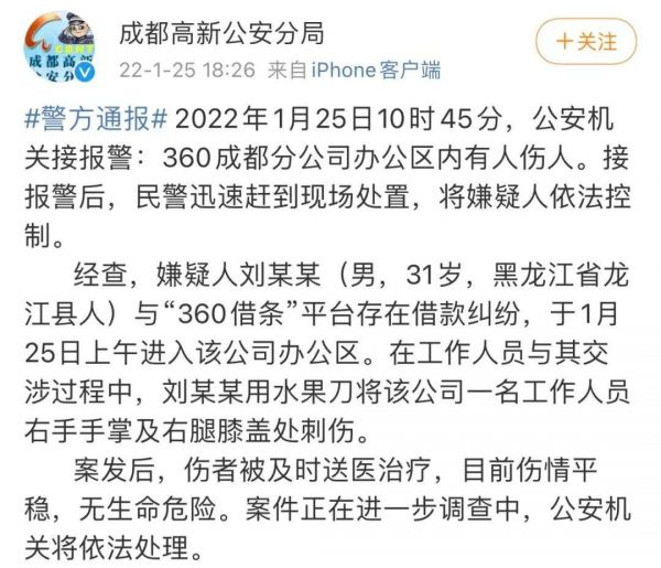 据成都高新公安分局发布通报:2022年1月25日10时45分,公安机关接报警:360成都分公司办公区内有人伤人。接报警后,民警迅速赶到现场处置,将嫌疑人依法控制。经查,嫌疑人刘某某(男,31岁,黑龙江省龙江县人)与“360借条”平台存在借款纠纷,于1月25日上午进入该公司办公区。在工作人员与其交涉过程中,刘某某用水果刀将该公司一名工作人员右手手掌及右腿膝盖处刺伤。案发后,伤者被及时送医治疗,目前伤情平稳,无生命危险。案件正在进一步调查中,公安机关将依法处理。