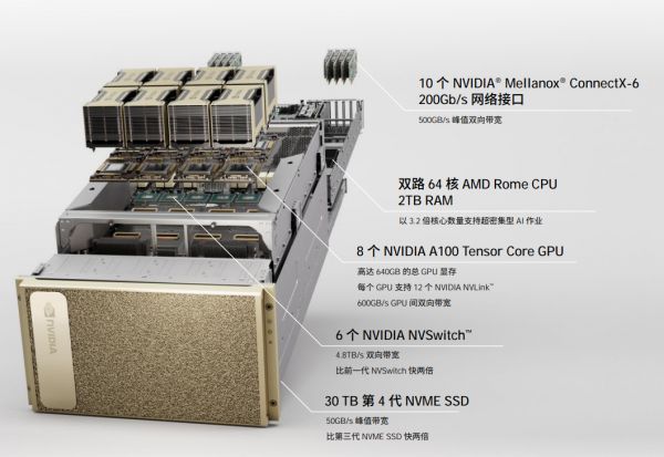 不仅如此,整个超算集群的单个节点之间的通讯带宽也获得了史无前例般的提升,达到惊人的16TB/s,并且实现一比一过载(也即每个 DGX A100 计算节点对应一个网络接口,不出现多节点共享接口争抢带宽资源的情况)