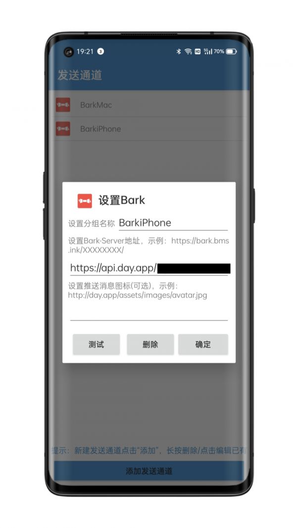 打开「短信转发器」,依次点击「发送通道」-「添加发送通道」,选择「Bark」,填入上一步在 iPhone 端 Bark App 中生成的推送地址,点击「确定」保存设置。