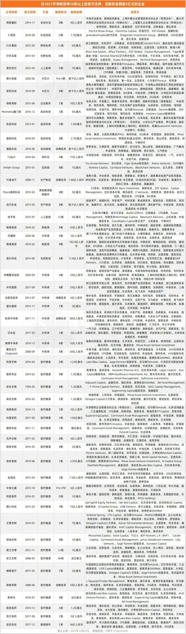 其中,能够一笔集齐 20 家以上资方的事件更是凤毛麟角。近 10 年来总共有 8 家企业获得此「殊荣」:微影时代在 2015 年获得 15 亿人民币 C 轮融资,背后披露的资方有 20 家,包括凤凰资本、腾讯、GGV 纪源资本等等;周鸿祎创办的奇飞翔艺在 2016 年获得数亿元 B 轮融资,资方数量 23 家;蚂蚁集团在 2018 年获得 103 亿美金 C 轮融资,资方 37 家,这也是一级市场投资史上单笔资方数量最多的一家;比亚迪半导体在 2020 年获得 8 亿元 A+轮融资,资方有 20 家。在 2021 年,积塔半导体、艾博生物、德尔科技、爱科百发 arkbio 获得的最新融资中的资方数量也均达到了 20 家以上。
