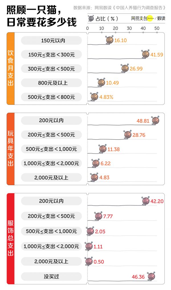 此前我们对中国人的养猫习惯做过调查,发现有 41.59% 的猫猫月均伙食花费在 150 元到 300 元之间,还有四成吃得更贵。