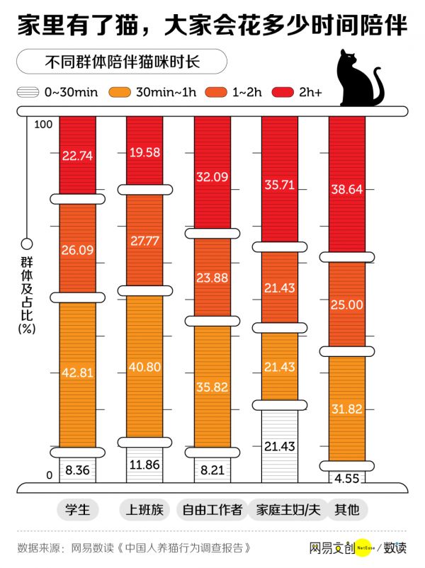 根据我们的调查,虽然不同职业的人陪伴猫的时间不同,但即使是最忙碌的上班族,多数人每天也得花半小时以上在猫身上。