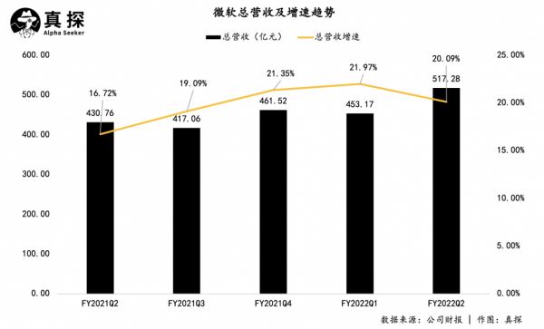 营收达到517亿美元,同比增长 20%,超过华尔街预期的507亿,也超过微软指引。
