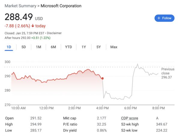 当季微软云服务业务收入同比增长32%达到220亿美元,业绩强劲。但随着基数增大,增速放缓,股价却在盘后交易中一度下跌逾 5%,后有回升,截止发稿前,上涨1.22%。
