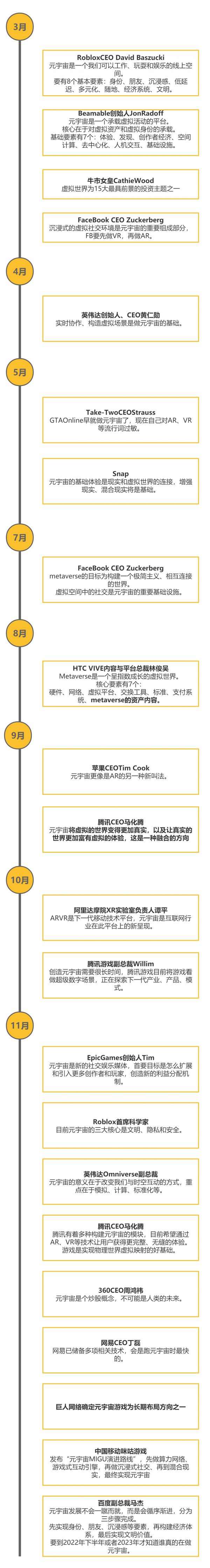 从各家老板、财富偶像们对元宇宙的观点总结来看,这波讨论从3月开始,逐渐从核心企业扩散到关联产业,到11月有了新一轮爆发。