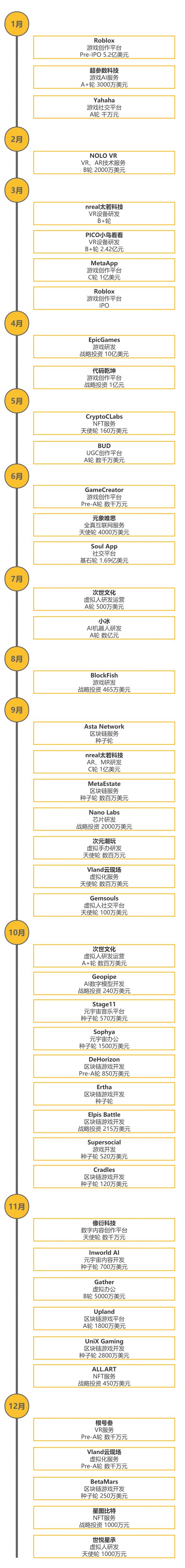 其中,上半年以元宇宙核心企业、游戏业为主,下半年开始有更多外部的,如影视、文旅甚至食品等传统企业入局。