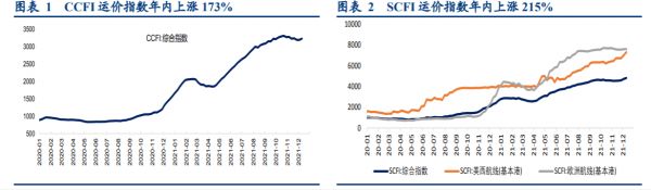 集运方面:2021年,集装箱海运在欧美进口需求持续高增、有效运力显著短缺的推动下形成了极大程度的供需错配,运价与船公司盈利持续创历史新高。运价方面:截至12月10日,中国出口集装箱运价指数CCFI均值2585点,同比上涨172.8%;上海出口集装箱运价指数SCFI均值3720点,同比上涨215.1%。