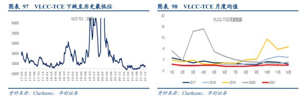 油运方面:供需矛盾凸显,导致油运TCE处于冰点。具体而言,2021年油运VLCC平均TCE水平下跌至三十年来历史最低位,全年维持底部震荡,截至12月10日,年内均值仅约3171美元/天,同比-94%,远低于2.5万美元/天左右的保本点,而油运TCE处于冰点的原因主要是由于“全球石油需求复苏进程承压,存量运力增明显加”这一供需矛盾引起的。