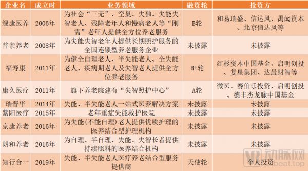 从上述信息可以看到,目前融资进展最快的即福寿康(上海)医疗养老服务有限公司,在2021年获得了由红杉资本中国基金领投的数亿元B+轮融资。该公司成立于2011年,宣称是国内最大的居家医护康养服务平台,能够为健全自理老人、半失能老人、全失能老人、疾病期老人及失智老人提供专业日常照护、医疗护理、专科护理及特需护理、康复指导及专业认知症照护的覆盖老人全需求及生命周期的一站式闭环服务平台。
