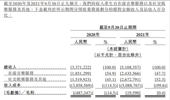 根据财报解释,内容服务成本包括了支付予音乐厂牌及独立音乐人的授权费以及直播表演者的直播公会收入分成成本。