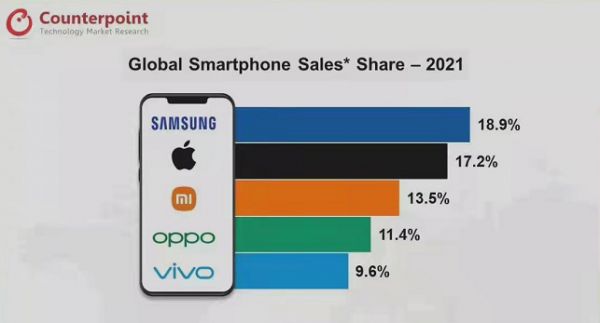 放眼整个2021年,Counterpoint的数据显示,三星以微弱优势战胜苹果排名第一,小米、OPPO、vivo在前五各占一席。