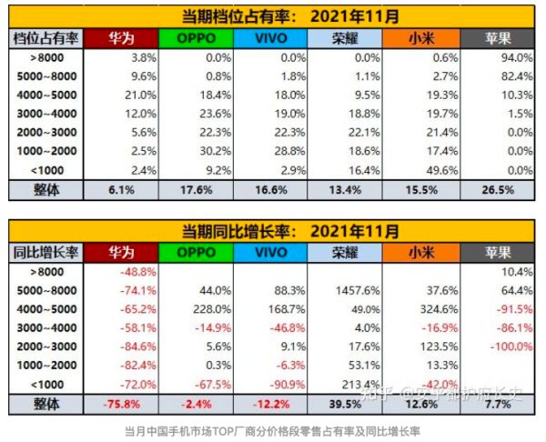 以11月为例,苹果在8000元以上档位占有率达到了94%,同比增长率10.4%,5000-8000元档位占比82.4%。而安卓厂商中,在8000元以上档位,小米占有率仅0.6%,OPPO、vivo、荣耀都未能占有一席之地;5000-8000元档位,小米占比仅2.7%,另外三家的市场占有率都不及小米;只有在4000-5000元档位,小米OV的占有率才分别接近20%,荣耀接近10%。
