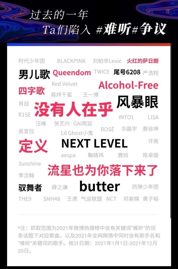 据《2021腾讯娱乐白皮书》,2021年,肖战、王一博、蔡徐坤、易烊千玺、张艺兴等“顶流”都纷纷陷入#难听#争议,在“难听”词云中榜上有名。只要他们有新歌发布,无论歌曲质量如何,#难听#两个字都会准时登上微博热搜。