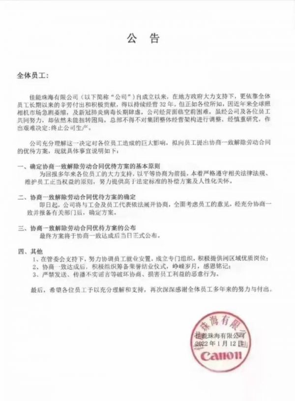 佳能珠海有限公司于2022年1月12日发布的公告,是这样解释的: