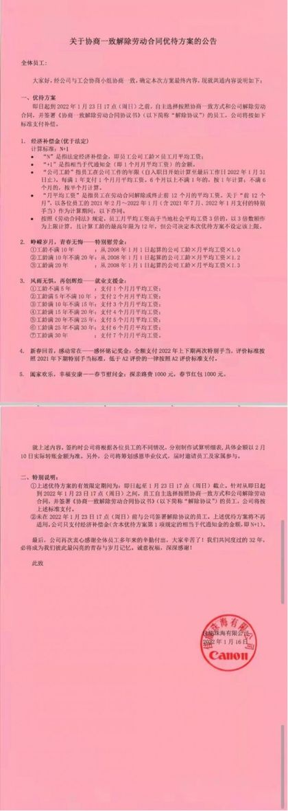 谁也没想到,珠海佳能给自己的员工送出了一份大礼包。