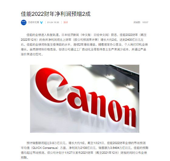 根据佳能财报,2022财年预计销售额将超过3.8万亿日元,净利润将达到2400亿日元左右,约合人民币132亿元。