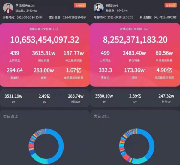 薇娅“存活”阶段的带货实力,备受公认:2020年,全年销售额310.9亿元;2021年天猫双十一预售首日,薇娅直播间销售额为82.52亿元。