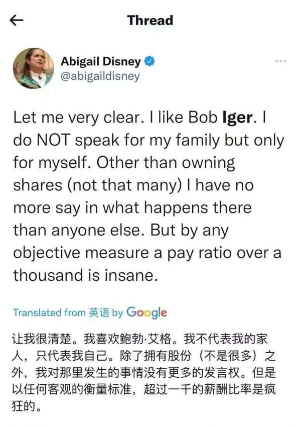不过,阿比盖尔的指控也得到了迪士尼公司的反驳,后者回应称CEO的薪酬90%是基于绩效的,艾格“为股东创造了非凡的价值”。这一点上,就连阿比盖尔都曾向艾格发邮件称赞,“无论以何种标准衡量,你都是一位伟大的CEO,甚至可能是目前美国最伟大的CEO。”