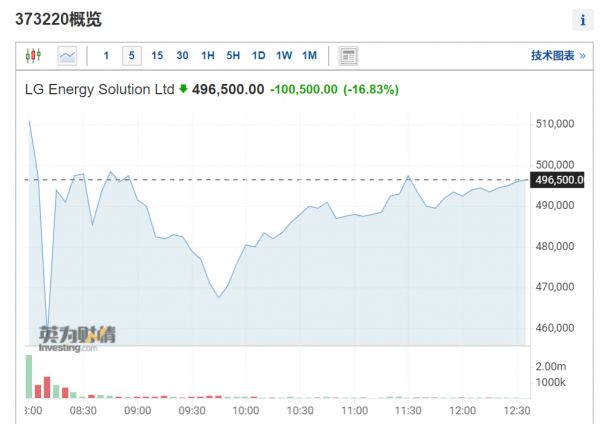 不过截至北京时间12时30分,LG新能源股价回落至49.65万韩元,较发行价上涨65.5%,较开盘价下跌16.83%,市值为119.67万亿韩元(约合6315亿元人民币)。目前在韩国上市公司市值排行榜上,LG新能源仅次于三星电子。