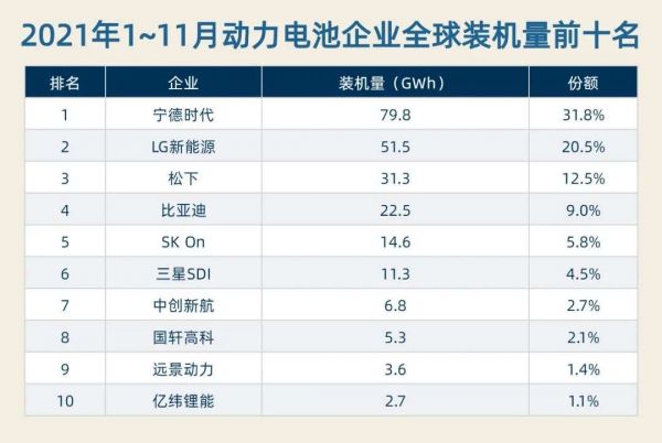 据SNE Research数据显示,2021年1~11月,LG新能源全球动力电池装机量累计为51.5GWh,同比增长90%,市场占有率20.5%,排名第二,较2020年市占率下降2.1个百分点。