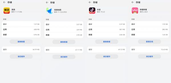 如百度网盘、抖音、滴滴出行、高德地图、京东、美团等应用,其对存储空间类目下的分类仅有应用、数据两项,用户能做的也只有“删除数据”选项。
