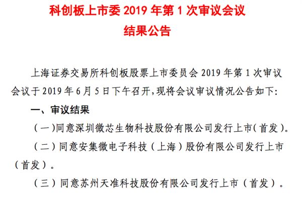 6月5日下午,上海证券交易所科创板上市委举行2019年第1次审议会议。审议结果公告显示,首批上会的3家企业均获通过,过会率为100%。