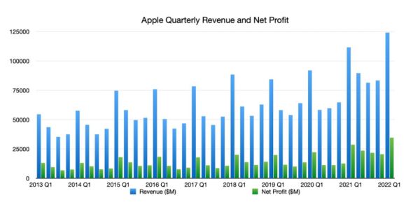 但今天,苹果却意外交出了一份让人惊艳的业绩报告,也总算是给了动荡不安的市场一丝心理安慰。根据苹果财报显示,2022年第一季度的营收为1239 亿美元,同比增长11%;净利润346.3亿美元,同比增长20%。各项指标都轻松超过市场预期,创下公司单季新高。值得注意的是,这已经是苹果连续第21个季度里跑赢市场预期,可以说是所有科技公司中最稳健的选手。