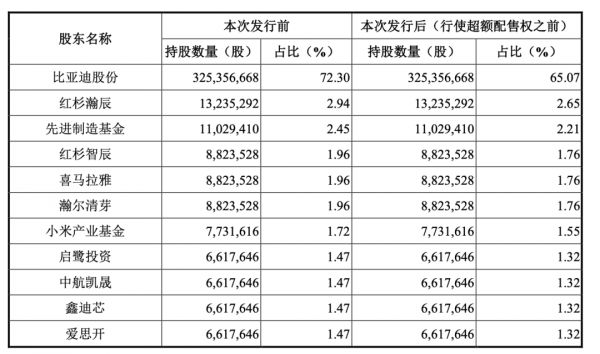 根据招股书,在IPO之前,比亚迪股份持股72.3%,为控股股东,此外,红杉中国、先进制造基金、小米产业基金等都是持股比亚迪半导体份额前十的股东。