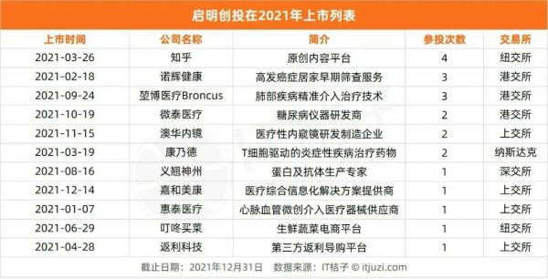 2021 年启明创投同样收获 11 家 IPO。知乎在 2021 年成功登陆纽交所,启明创投 4 次参投,最早一次的投资可追溯到 2012 年,彼时知乎刚成立 1 年,用户数也不到 10 万,之后随着知乎逐渐扩大,启明继续追投,又参与其 B 轮、C 轮、D 轮投资,IPO 前,启明创投持有其 11.3% 的股份;另外,启明创投还是 2021 年 IPO 企业叮咚买菜和返利科技的投资方。