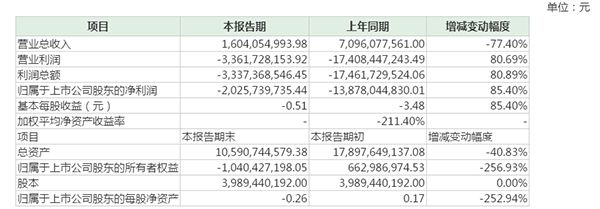 根据上述测算情况,报告期公司实现营业总收入160,405.50万元,较去年同期下降77.40%;营业利润为-336,172.82万元,较去年同期增加80.69%;利润总额-333,736.85万元,较去年同期增加80.89%;归属于上市公司股东的净利润为-202,573.97万元,较去年同期增加85.40%;基本每股收益为-0.51元,比去年同期增加85.41%。