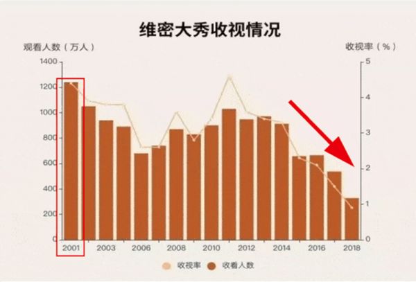 2001年,维密秀首次在ABC电视台播出,观看人数高达1240万人次。到2015年已近乎腰斩,只余659万。2017和2018年进一步暴跌至537万和327万,连续创下历史新低。
