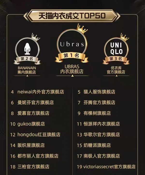 2021年双11,天猫内衣品牌店铺销售额前四名分别是UBRAS、蕉内、优衣库和内外,维密官方旗舰店排在第19位。