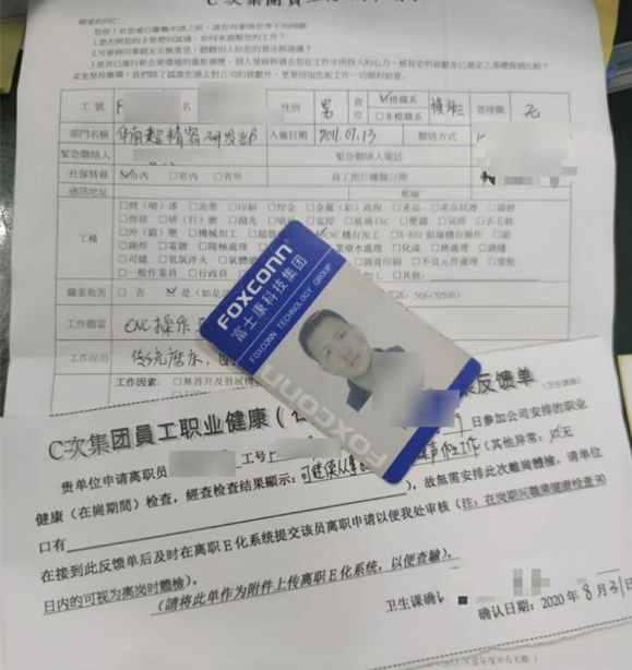 胖虎离开富士康的离职申请及刚入厂时的照片。图源:受访者提供