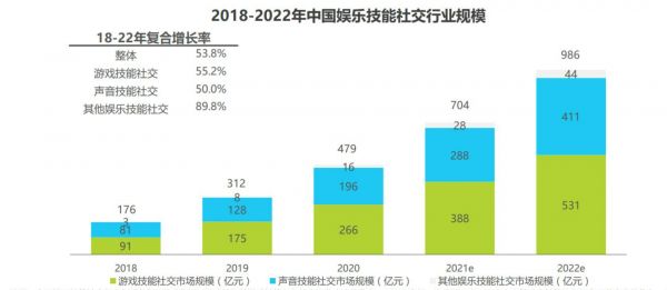 至于游戏行业这边,根据艾瑞咨询统计的数据,截止2020年中国游戏技能社交行业市场规模达到266亿,且在2018-2022年间保持着44%以上的年均复合增长率。其中,诸如游戏直播、游戏陪玩、游戏社交等诸多场景,都具备极高的商业化潜力。