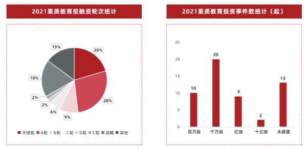 目前资本对素质教育的投资较为谨慎,具体表现为,2021 年素质教育的投融资轮次主要集中在 A 轮及以前,金额以数千万元及以内为主,主要以前期项目为主,机构试探性投资明显。
