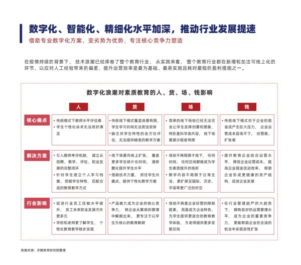 二是新技术将加速素质教育发生变革。如 AI+ 教育、OMO、虚拟现实等技术正在对素质教育的应用场景产生实际的促进作用。数字化浪潮对素质教育的人、货、场、钱,均产生不同影响。借助专业数字化方案,素质教育企业可变劣势为优势,专注核心竞争力塑造。