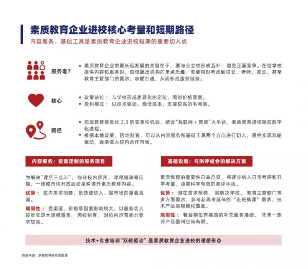 三是素质教育逐渐从校外向校内迁移,进校前景广阔。在全面发展素质教育的政策推动下, 课后服务是校内发展素质教育的重要方式。国家政策鼓励学校购买优质的课后服务和校外培训服务为校内素质教育提供有益补充。而对素质教育企业而言,内容服务、基础工具是素质教育企业进校短期的重要切入点。