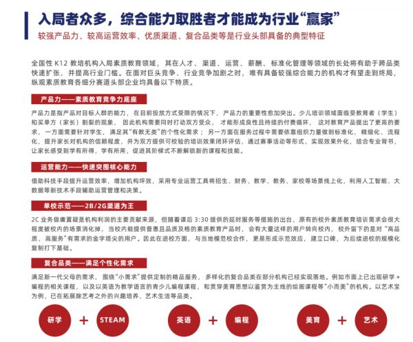 供给端方面,随着用户对素质教育内容的多元性需求的增长,短期会出现培训产品同质化、低价营销抢市场的局面。但从长远来看,市场的变化也倒逼教育机构在产品、服务方面做优化与升级,以更好匹配市场的需求。除了产品、服务外,当刚性需求增强,素质教育企业也需要考虑,究竟如何扮演校内教育的有益补充?