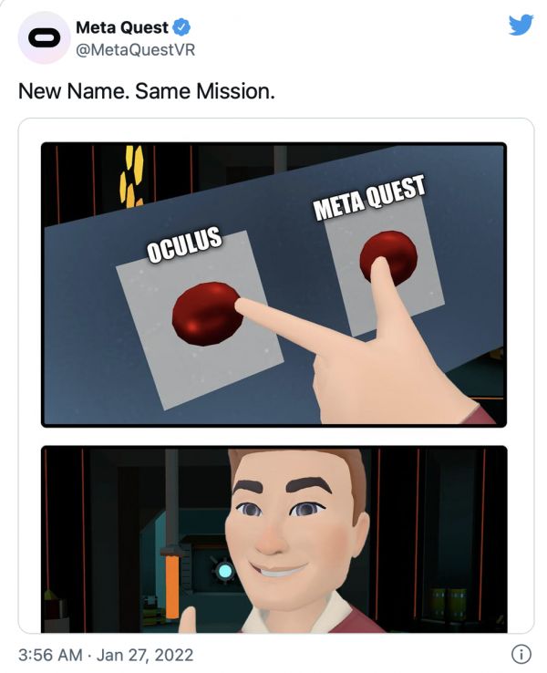 而近日,Facebook 官方正式将 Oculus Quest 2 更名为 Meta Quest。为了「软化」消息带来的冲击,Meta QuestVR 还玩了一手「梗图」——两个红色药丸分别写上了「Oculus」和「Meta Quest」的字样,表示选哪个都一样。