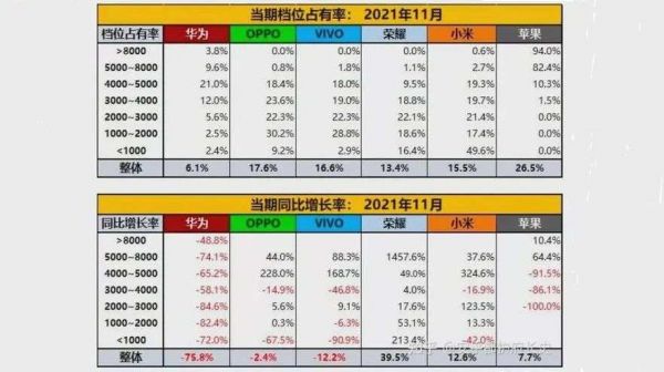 从知乎用户@安乎都护府长史提供的数据中我们可以看出,以11月为例,苹果在8000元以上档位占有率达到了94%,5000-8000元档位占比82.4%。而安卓厂商中,在8000元以上档位,只有小米有占有率,OPPO、vivo、荣耀都未能占有一席之地;5000-8000元档位,小米占比仅2.7%,另外三家的市场占有率都不及小米。在“华为跌倒”后,小米、vivo、OPPO、荣耀们追赶苹果并非易事。