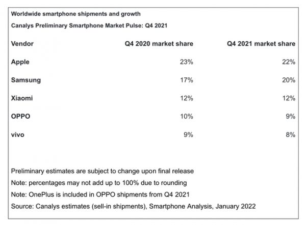 从市场角度来看,市场研究机构Canalys发布的最新报告指出,凭借iPhone 13系列的强劲需求,苹果第四季度出货量占全球智能手机出货量的22%,重新坐上全球智能手机市场的头把交椅。上季度的头把交椅三星如今滑落到第二,市场份额为20%,国产厂商小米、OPPO和vivo位列第三、四、五。