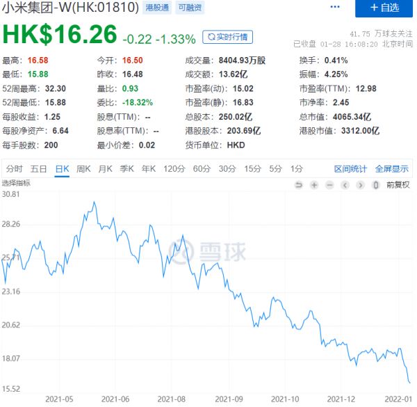 雷达财经注意到,1月27日,小米报收于16.48港元,再度跌破17港元的发行价。1月28日小米股价盘中跌至15.88港元,创下2020年8月份以来新低,最终报收于16.26港元。以2021年1月份的最高价35.9港元/股计算,一年时间里小米市值蒸发4900亿港元。