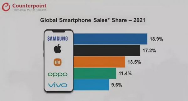 就2021年全年来看,Counterpoint的报告显示,全球市场智能手机市场上,三星以微弱优势战胜苹果排名第一,小米、OPPO、vivo在前五各占一席。