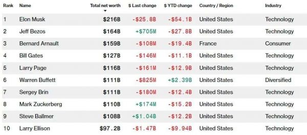 全球首富、特斯拉首席执行官马斯克(Elon Musk)的财富 缩水了541亿美元, 至2160亿美元,原因是这家电动汽车公司的股价在本月暴跌了21%。同样,电子商务集团亚马逊(Amazon)联合创始人贝索斯(Jeff Bezos)的 净资产也缩水了278亿美元 ,至1640亿美元,该公司股价在今年暴跌了18%。