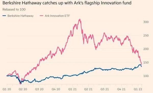 注:红线为ARKK走势,蓝线为伯克希尔