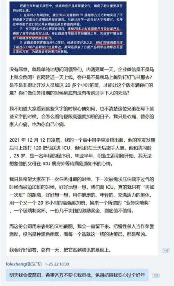 「明天我会提离职,请各方不要卡我审批,免得妨碍我安心过个好年」。日前,一位腾讯公司旗下企业微信部门IT员工,在公司内部工作群声讨加班文化后发表了这则任性的离职宣言。